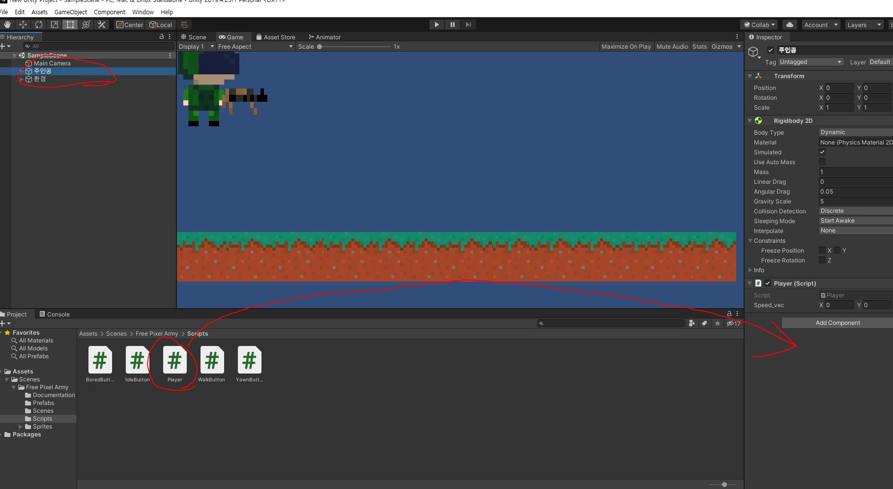 스크립트를 통해서 2D캐릭터의 움직임을 구현하였다.