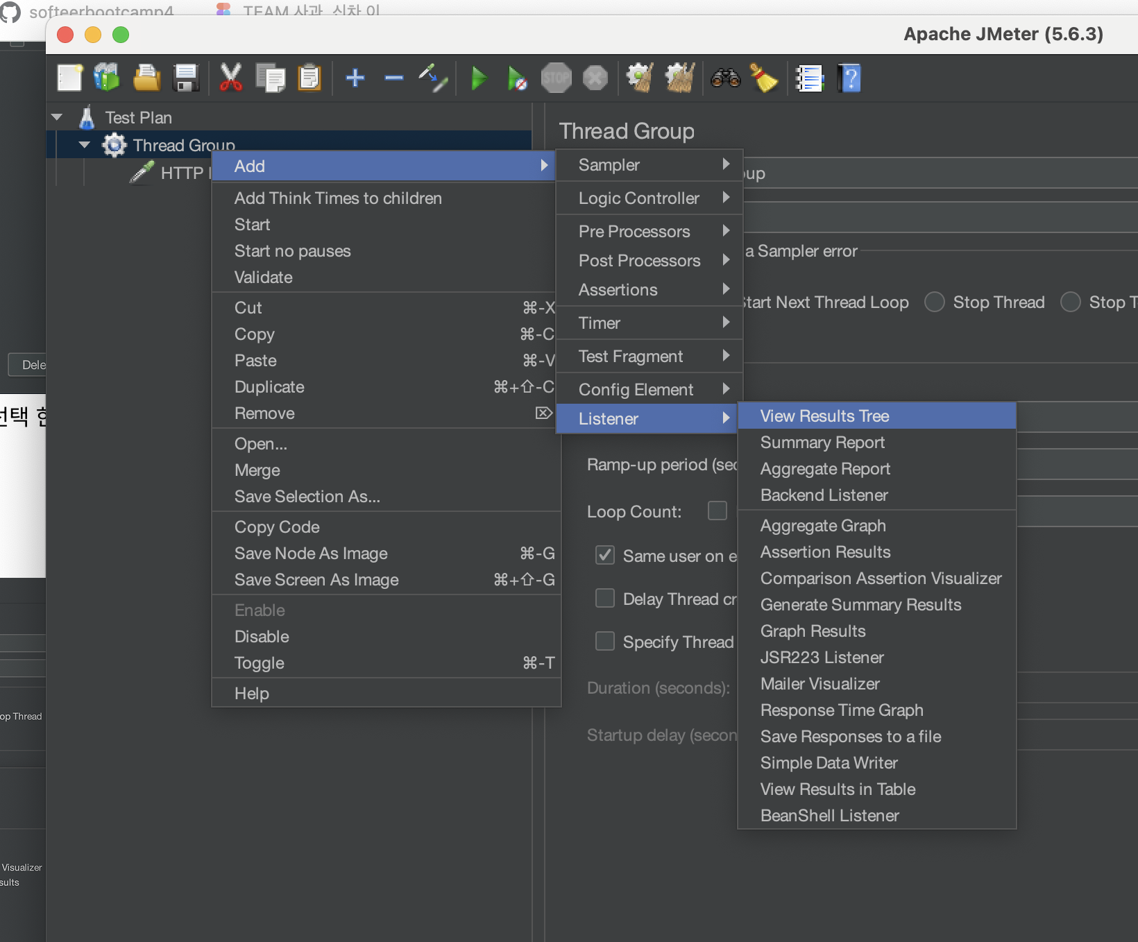 Thread Group에서 오른쪽 클릭, Listener 에서 원하는 결과를 볼 수 있게 설정해준다.