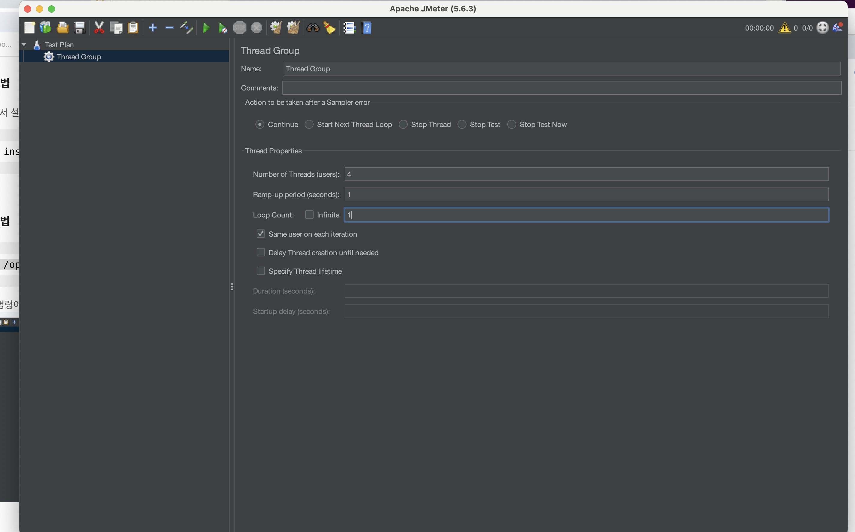 테스트 플랜의 Thread Group을 설정해주면 된다