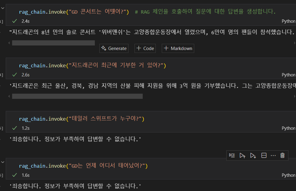 참고로 프롬프트는 짜기 나름인데 나는 "당신은 QA 전문가이며, context를 참고하여 question에 답변하라. 만약 모든 Context를 다 확인해도 정보가 없다면, "죄송합니다. 정보가 부족하여 답변할 수 없습니다."를 출력하세요라고 명시하였다.
