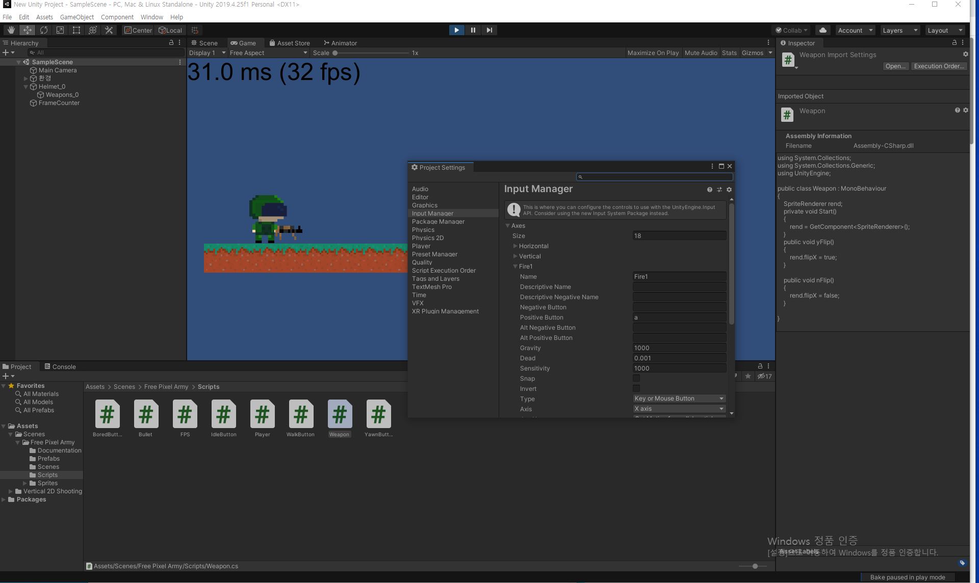 일단 본격적으로 스크립트를 수정하기에 앞서서 Edit->ProjectSettings->Input Manager에 들어가서 아래사진과 같이 Fire1버튼을 A로 설정해주자. 나는 이번 프로젝트에서 총알 발사 버튼을 A로 해줄꺼여서 아래처럼 설정했으므로 자기가 편한대로 해도 무방하다.