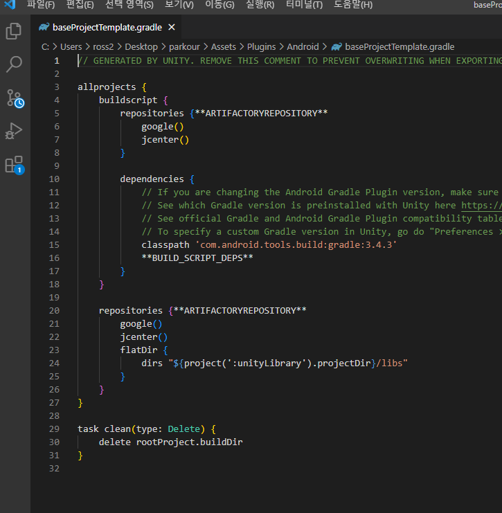 폴더중 Plugin->Android로 들어가서 baseProjectTemplate.gradle 파일을 킨다.