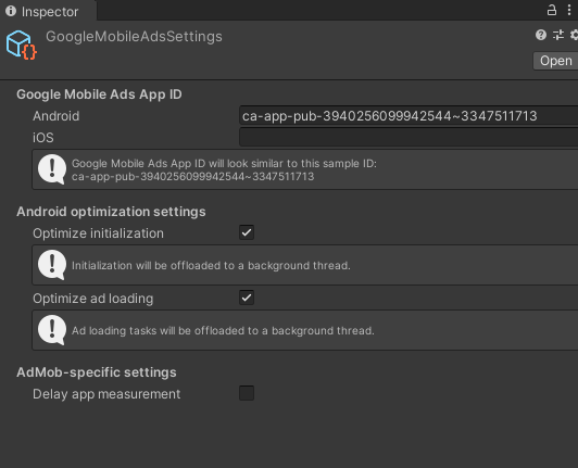 인스펙터 창에 위와같이 뜬다. 원래 AppID는 각자 GoogleMobileAds 들어가면 확인 할 수 있다.