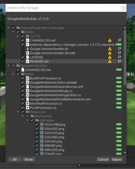 README.md나 다른 파일들은 그냥 뭐 패치내역, 사용법 그런것들이어서 상관없었다. 하지만 위의 두 파일은 꼭 빼고 import 해주어야 한다고 한다. 사실 나도 다른 유튜브 보고 알게 되었다 ㅎㅎ. 저거 2개를 빼도 Google MobileAds는 잘 작동했다.