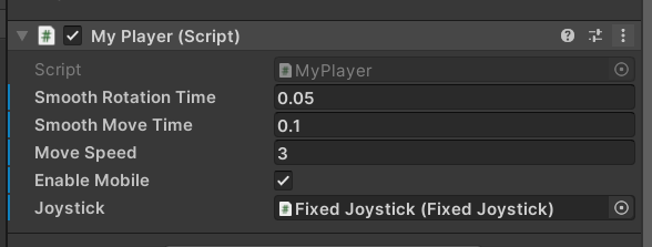 이제는 enableMobile이 true이면 조이스틱에서 Input값을 받아오는 것이다. 당연히 인스펙터 창에서 MyPlayer.cs에 조이스틱을 붙여줘야한다. 드래그 앤 드롭으로 붙여주자.