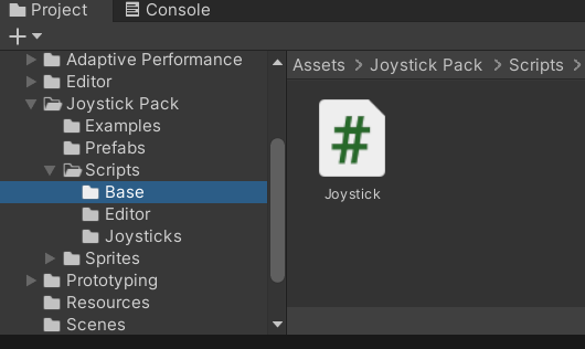 위와 같이 JoystickPack이 Import된걸 확인 할 수 있다. 그렇다면 Joystick Pack -> Scripts -> Base -> Joystick.cs도 확인 할 수 있다. 다른 조이스틱 스크립트들(FixedJoystick.cs, DynamicJoystick.cs ....)들은 모두 Joystick.cs를 상속받는다.