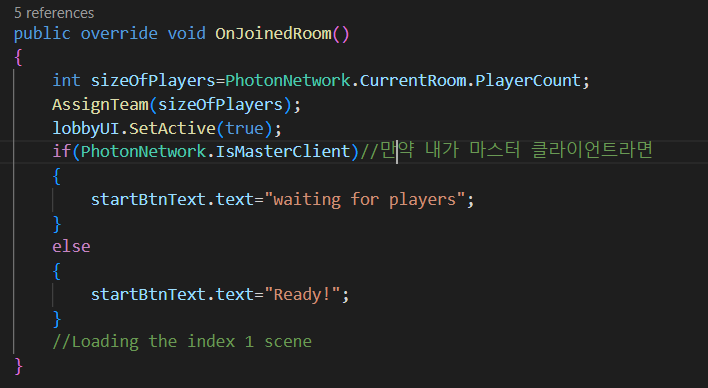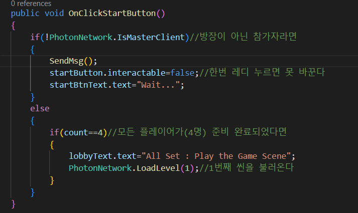 그리고 만약 중앙에 버튼을 눌렀을때 마스터 클라이언트인지 아닌지에 따라 코드가 다르게 실행되게한다.