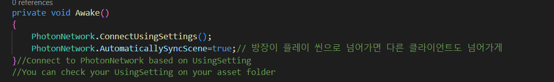 위와 같이 PhotonNetwork.AutomaticallySyncScene=true를 넣어준다