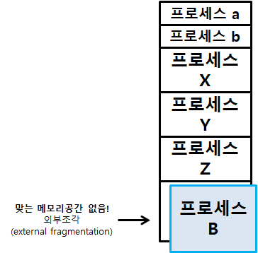 - 외부 단편화 : 프로그램의 크기보다 분할의 크기보다 작은경우에는 해당 분할이 비어 있는데도 불구하고 프로그램을 적재하지 못하기 때문에 발생하는 현상