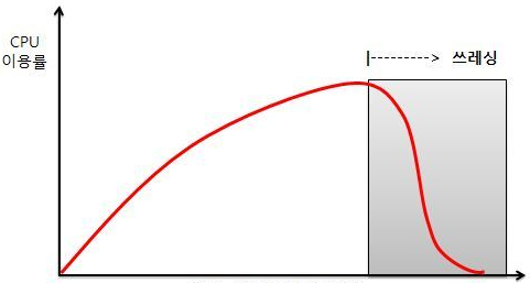 - 페이지 부재율(Page fault)이 증가하여 CPU 이용율이 급격하게 떨어지는 현상