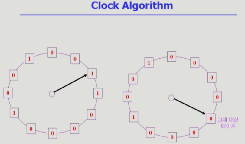 - reference bit이 0인 것을 찾을 때까지 포인터를 하나씩 앞으로 이동한다.
