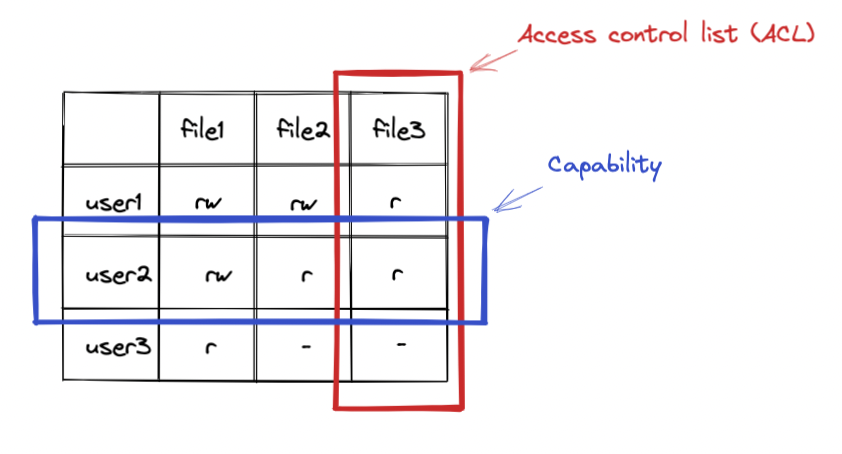 - Access control list : 파일별로 누구에게 어떤 접근 권한이 있는지 표시